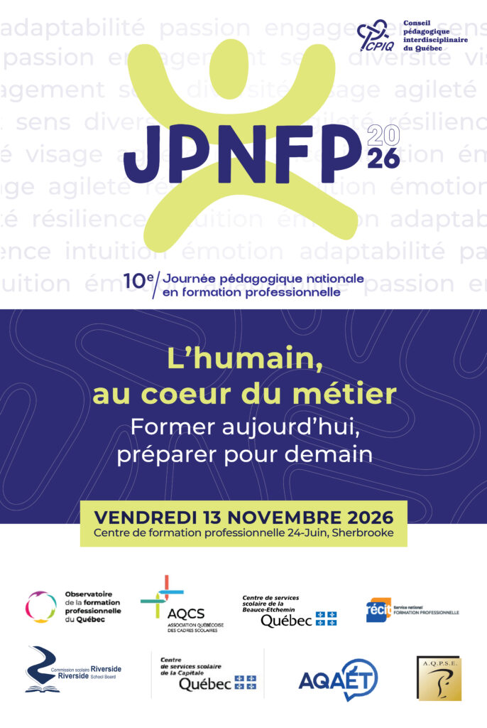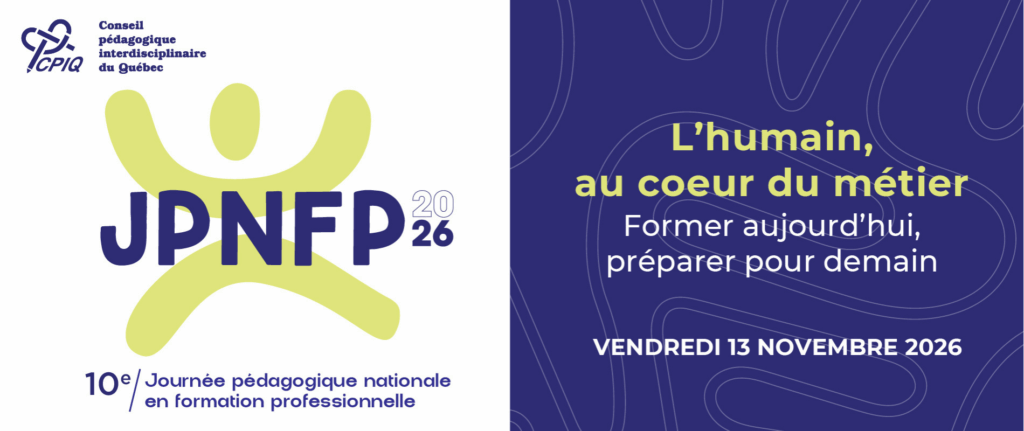 La 10e Journée pédagogique nationale en formation professionnelle aura lieu le 13 novembre 2026 en mode hybride. Elle rassemblera des enseignants de la formation professionnelle, des conseillers pédagogiques, des cadres et d’autres intervenants du milieu qui, comme vous, participent à la reconnaissance, le développement et la valorisation de la formation professionnelle.