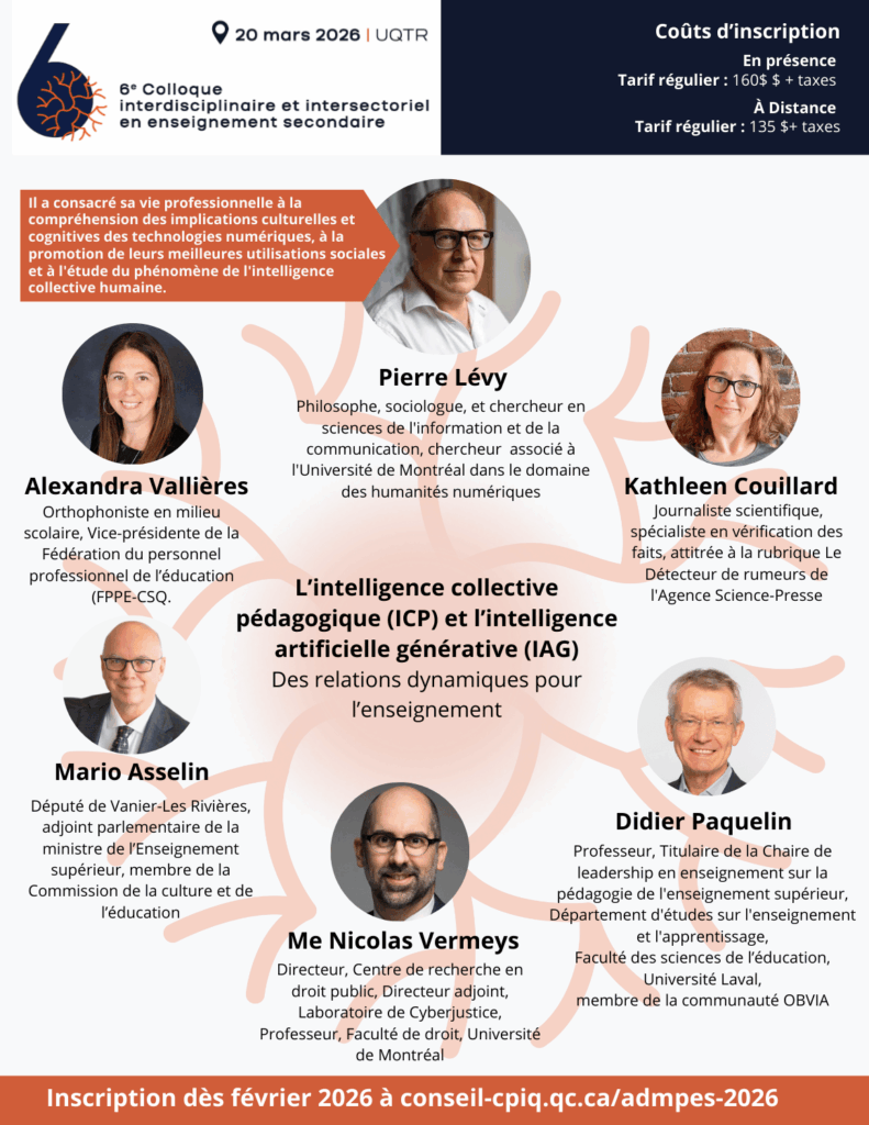 Le thème central du colloque L’intelligence collective pédagogique (ICP) et l’intelligence artificielle générative (IAG) : Des relations dynamiques pour l’enseignement. sera consacré à la coconstruction d’une intelligence collective dans le contexte du développement de l’intelligence artificielle. Nous définissons l’intelligence collective comme la capacité d’un groupe à résoudre des problèmes et à innover, tout en reposant sur la synergie des compétences, des expériences et des perspectives des participants . ll s’agit d’une intelligence émergente qui résulte de l’interaction et de la collaboration entre les individus, ce qui est l’objectif du colloque